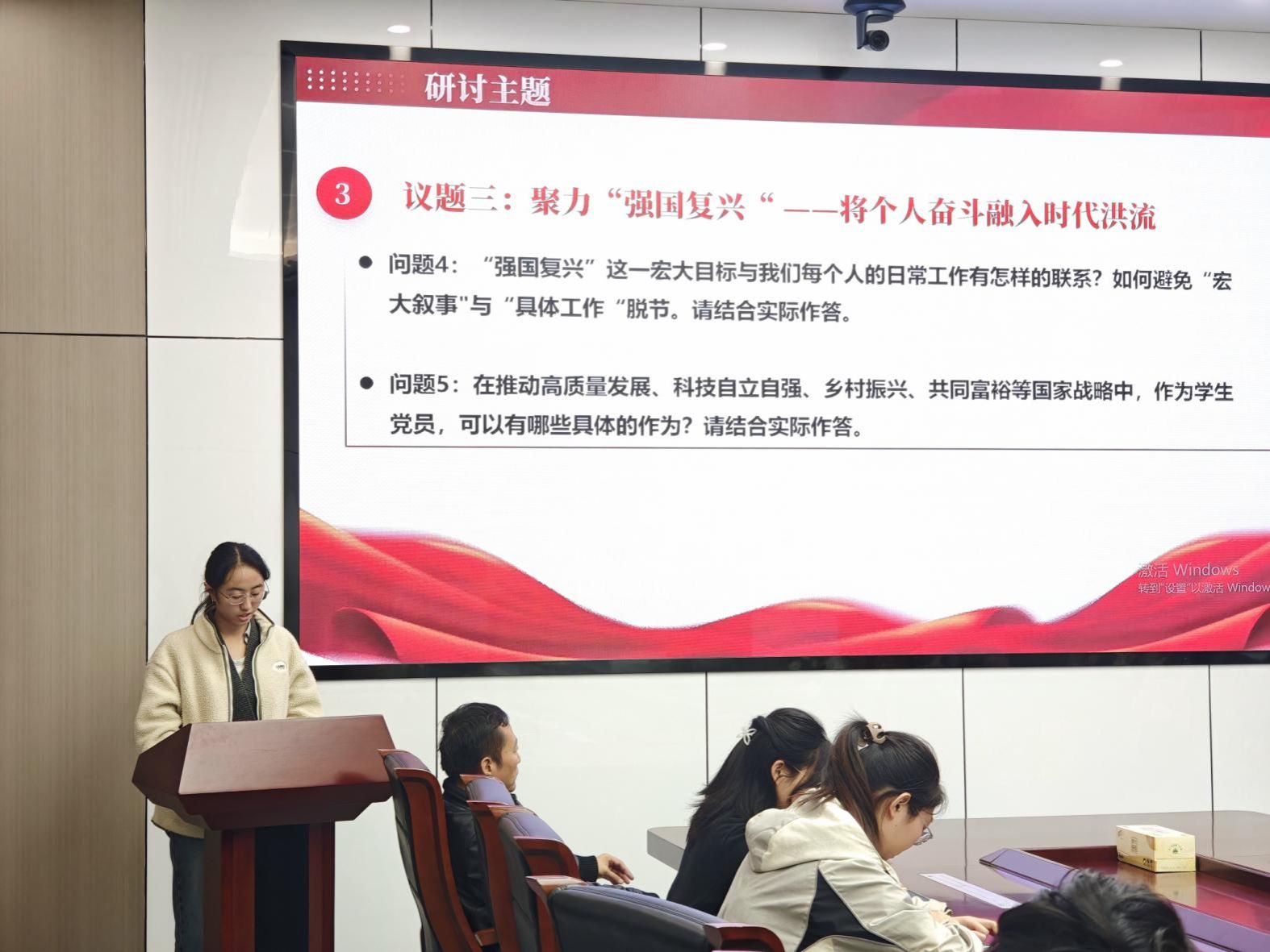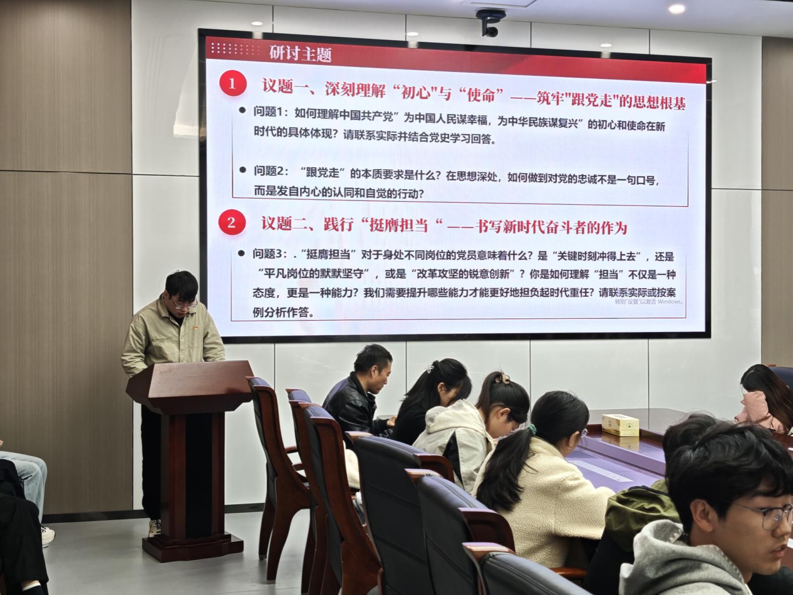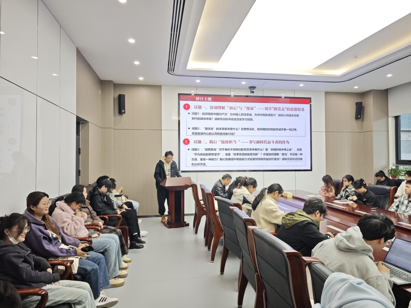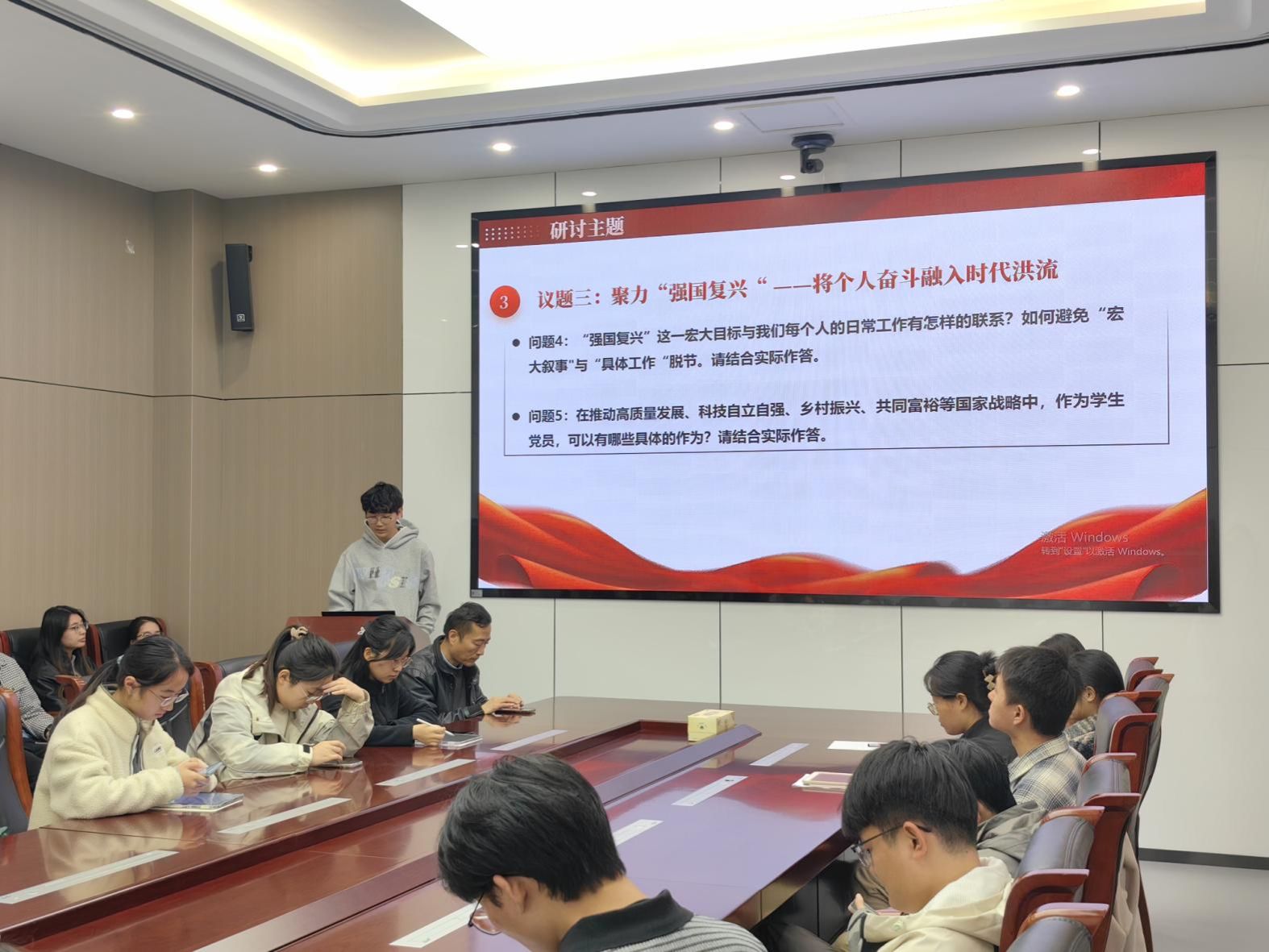在分组研讨环节,与会党员混合分为五组,围绕“初心使命”“挺膺担当”“强国复兴”三大议题开展交流讨论。大家从党史学习、科研实践和志愿服务等方面出发,思考新时代青年如何将个人奋斗融入国家发展大局。各组代表依次汇报讨论成果,现场交流踊跃,思想碰撞热烈。