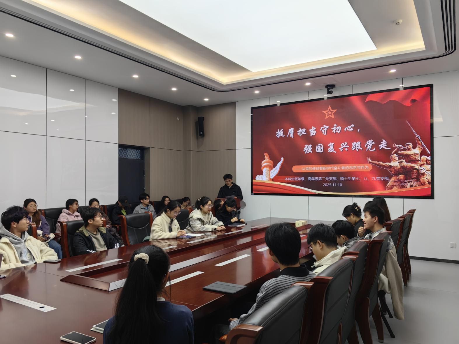 在集中学习环节,硕士生第九党支部书记赵祎璠带领全体党员回顾了第二次集中大课内容,回顾了新时代中国共产党的奋斗目标与历史使命,号召青年党员坚定理想信念,筑牢思想根基。