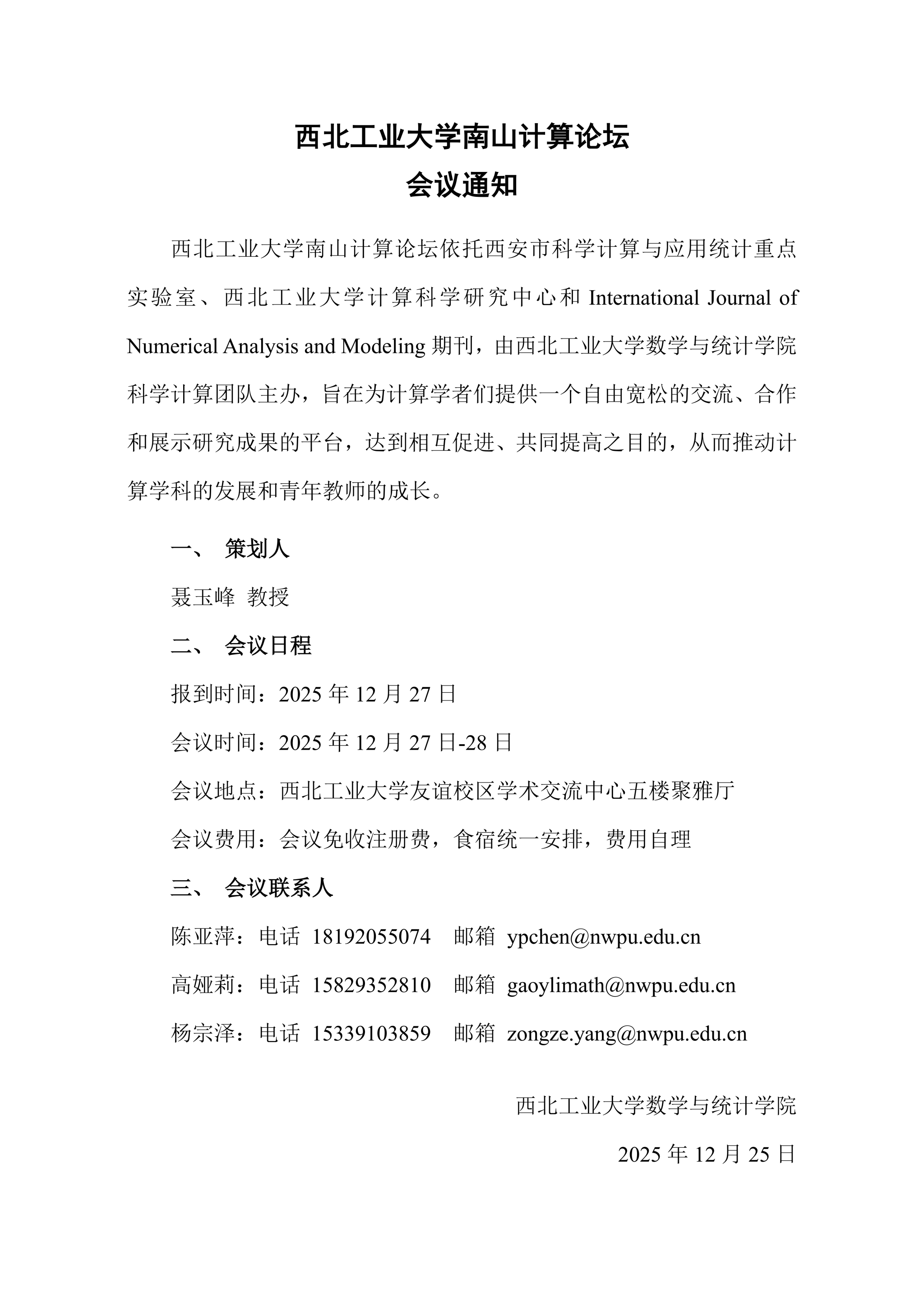 西北工业大学南山计算论坛会议通知