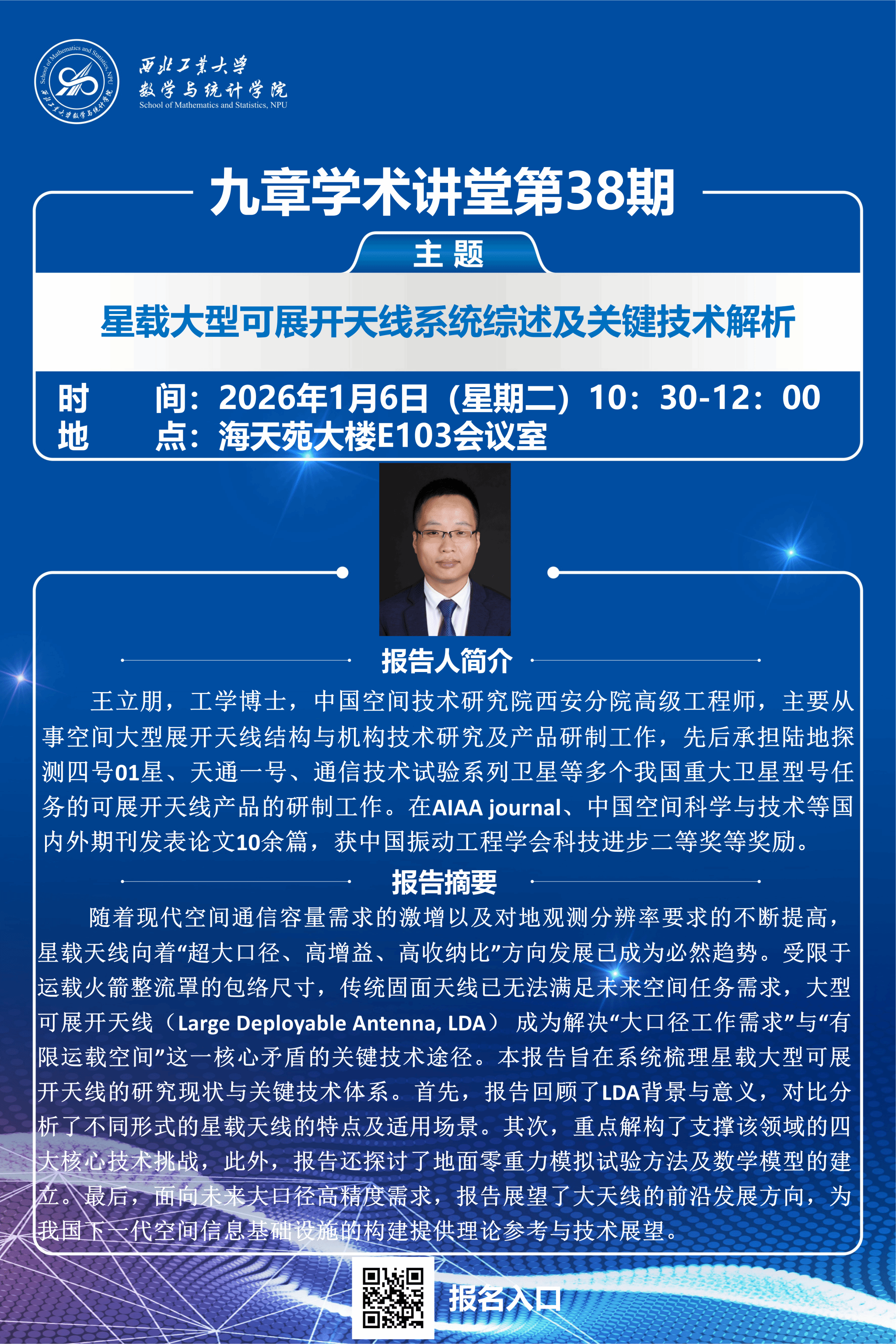 2026年1月6日上午,性爱直播-性爱直播官方网站 第38期“九章学术讲堂”在海天苑大楼E103会议室成功举办。本期讲堂特邀中国空间技术研究院西安分院高级工程师、工学博士王立朋担任主讲,以“星载大型可展开天线系统综述及关键技术解析”为主题,为性爱直播 相关专业师生带来一场聚焦航天工程前沿的深度分享。