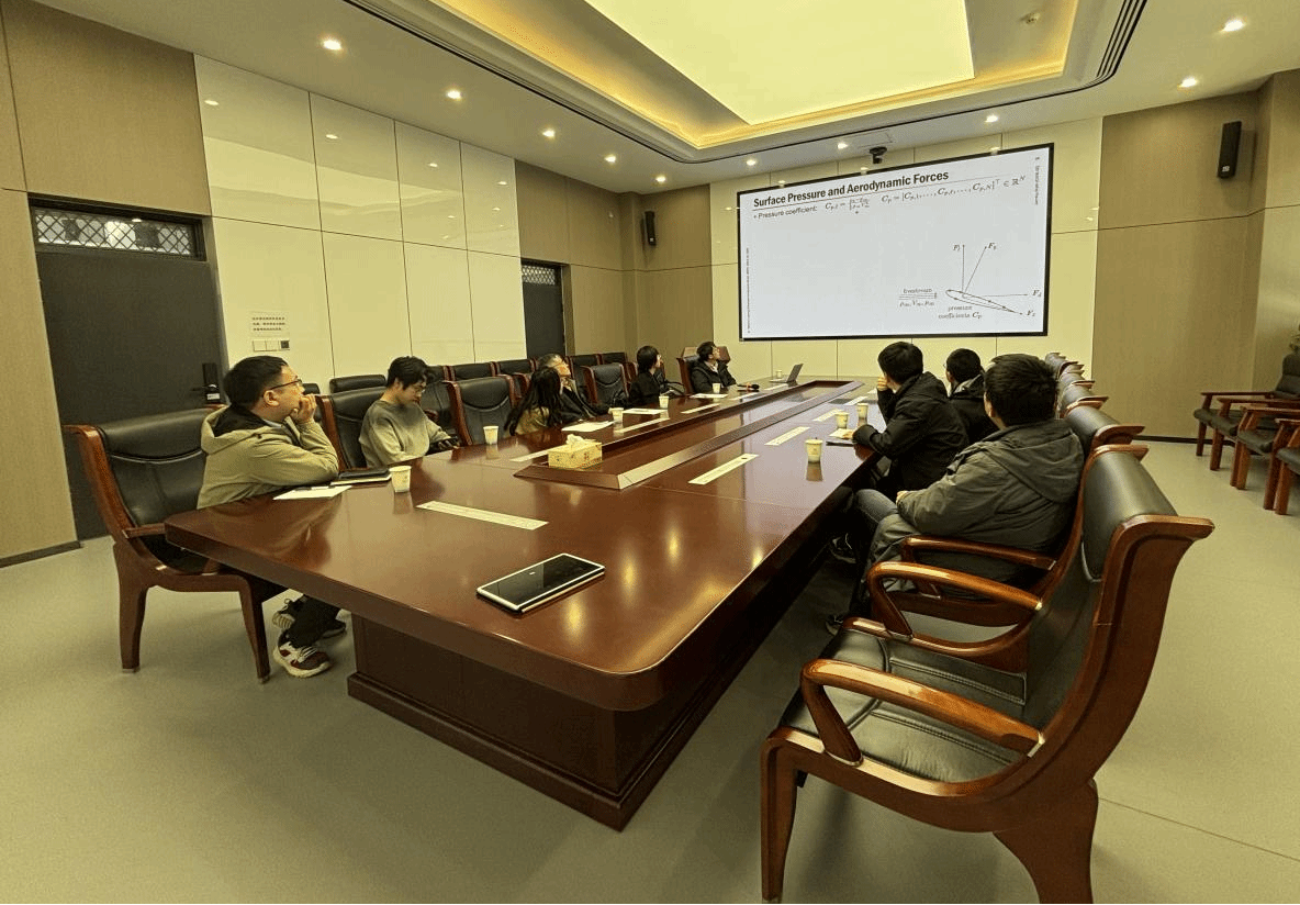 段俊明以《Machine-learning-enhanced aerodynamic forces prediction based on sparse pressure sensor inputs》为主题,聚焦稀疏压力传感器输入下机器学习增强的气动力预测研究,为在场师生带来了一场前沿的学术分享。