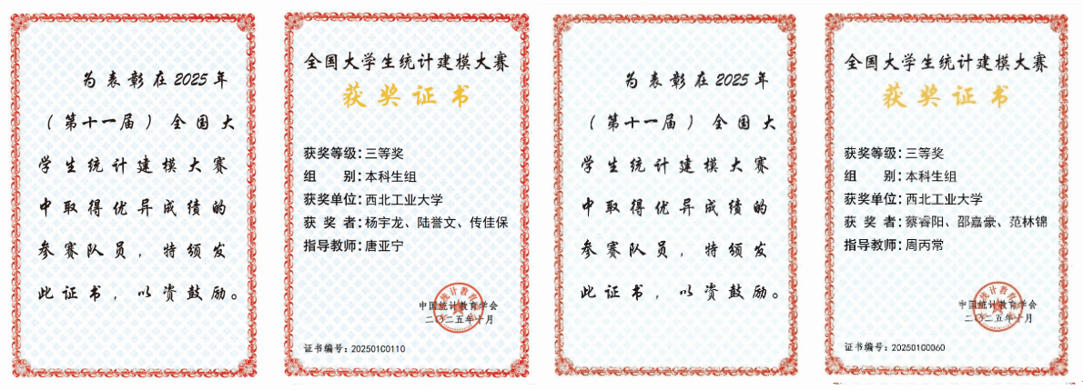 近日,全国大学生统计建模大赛国家组委会公布最终成绩,西北工业大学统计建模队伍喜获佳绩,创下历史性突破。我校学子在本届大赛中荣获国家三等奖两项,实现了我校在该赛事中历史性突破。
