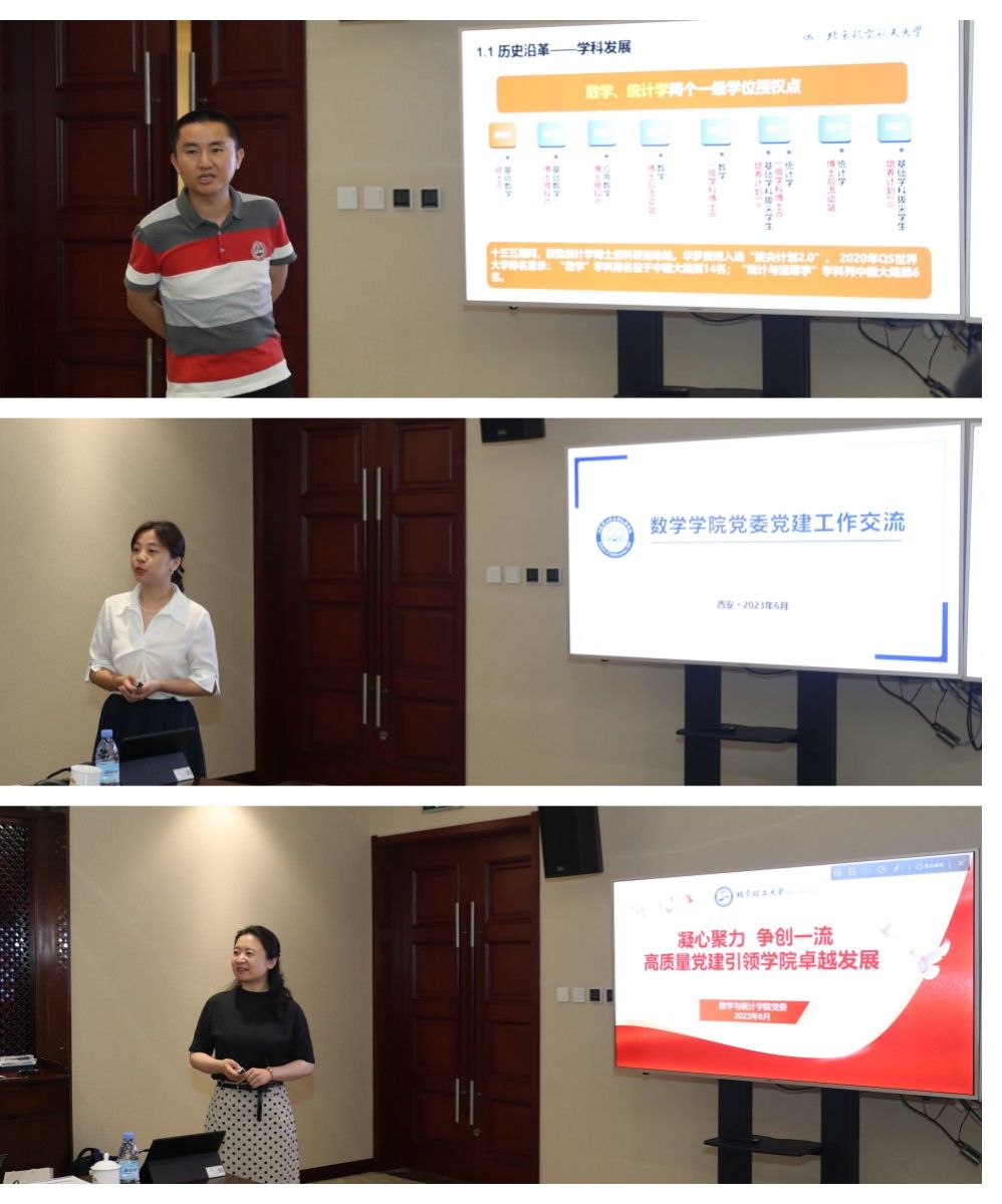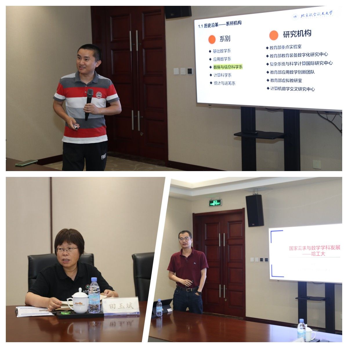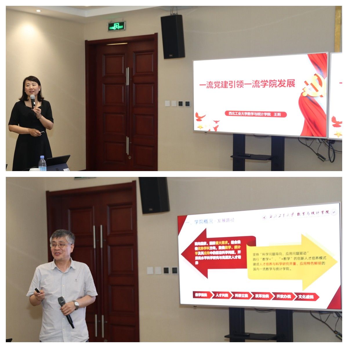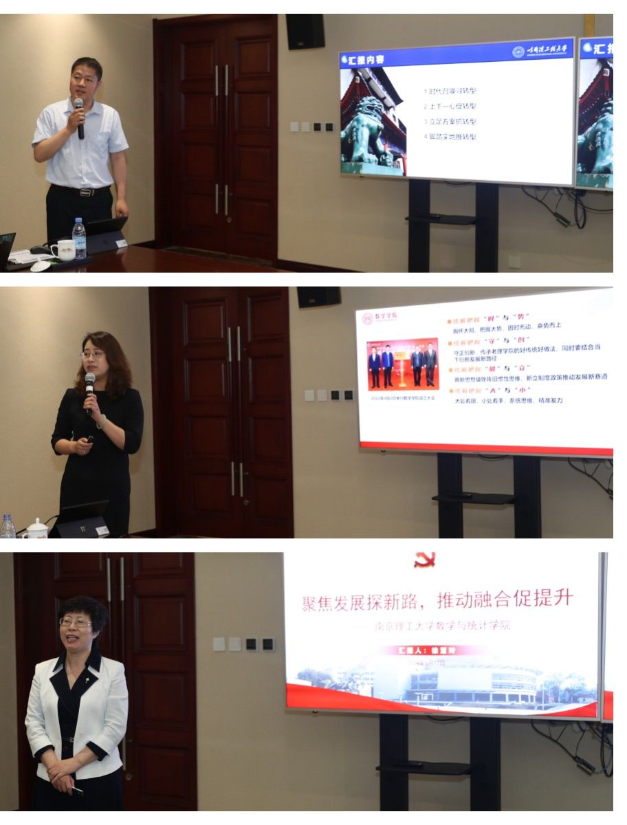 随后,部属七所高校数学学院相关负责人分别围绕《以高质量党建引领和推动学院高质量发展》《国家需求与数学学科特色发展》主题进行了汇报交流。北京航空航天大学数学科学学院在党建工作中形成的“夯基础、促改革、做党建研究”的工作思路,在学科发展工作中提出的“大数学”立体化数学人才培养体系的建立;北京理工大学性爱直播 在党建工作中形成的“三确保、两提升、一促进”的工作理念,在学科发展工作中提出的对硬核基础数学队伍的培养方式;哈尔滨工业大学数学学院在党建工作中提出的打造“金牌专业、金牌课程、金牌教师”,实现“出成果、出名师、出人才”的学院奋斗目标,在学科发展工作中提出的“三个对标”的科学研究发展策略;哈尔滨工程大学数学科学学院在党建工作中提出的“四转型”工作思路及举措,在学科发展工作中推行的“六计划”重点举措;南京航空航天大学数学学院以“四融”党建推动学院高质量发展的工作思路,在学科发展工作中打造的“一体两翼双助力”的发展体系;南京理工大学性爱直播 形成的“三开三共”的党建工作理念和“三融三聚”的党建工作思路,在学科发展工作中推行的创新发展思路以及我校性爱直播 在党建工作中“1745”发展思路,在学科发展工作中提出的“数学+”“+数学”的创新人才培养模式。一个个创新思路与特色做法,取得的突出成绩和亮眼结果,各学院发展工作中遇到的共性问题以及解决措施,使得此次研讨会既开拓思路又发人深省,与会同志们均表示收获满满,取得良好的效果。