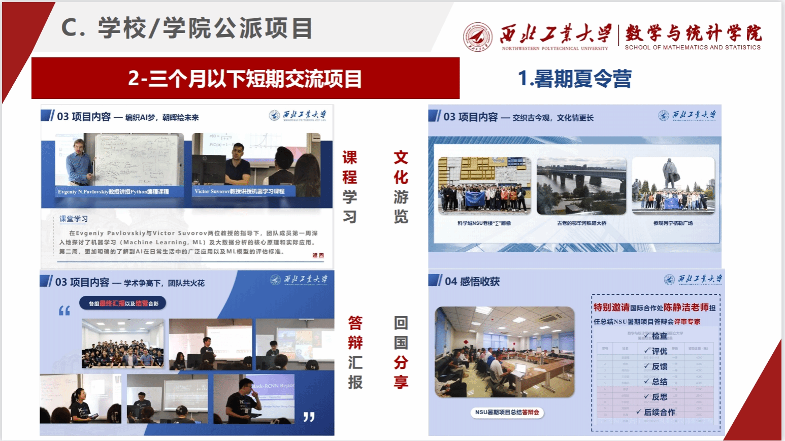 宣讲会分为三个部分:分别为学生出国境“项目介绍”,“资助办法”和“手续流程”。在学生出国境“项目介绍”过程中,根据派出类别,又分为国家公派留学项目、赴国际组织实习项目及学校/学院公派项目三种形式。