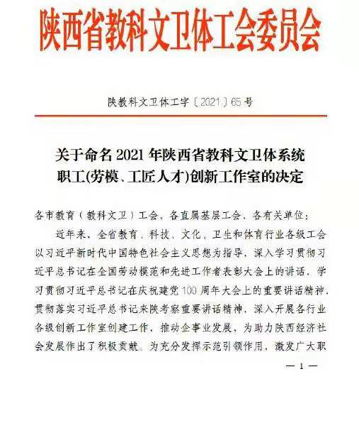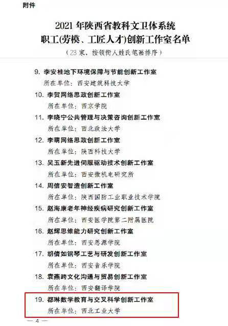 日前,从陕西省教科文卫体工会传来喜讯,在公布的23所“2021年陕西省教科文卫体系统职工(劳模、工匠人才)创新工作室”名单中,由性爱直播-性爱直播官方网站 都琳教授领衔成立的“都琳数学教育与交叉科学创新工作室”榜上有名,正式获批挂牌。